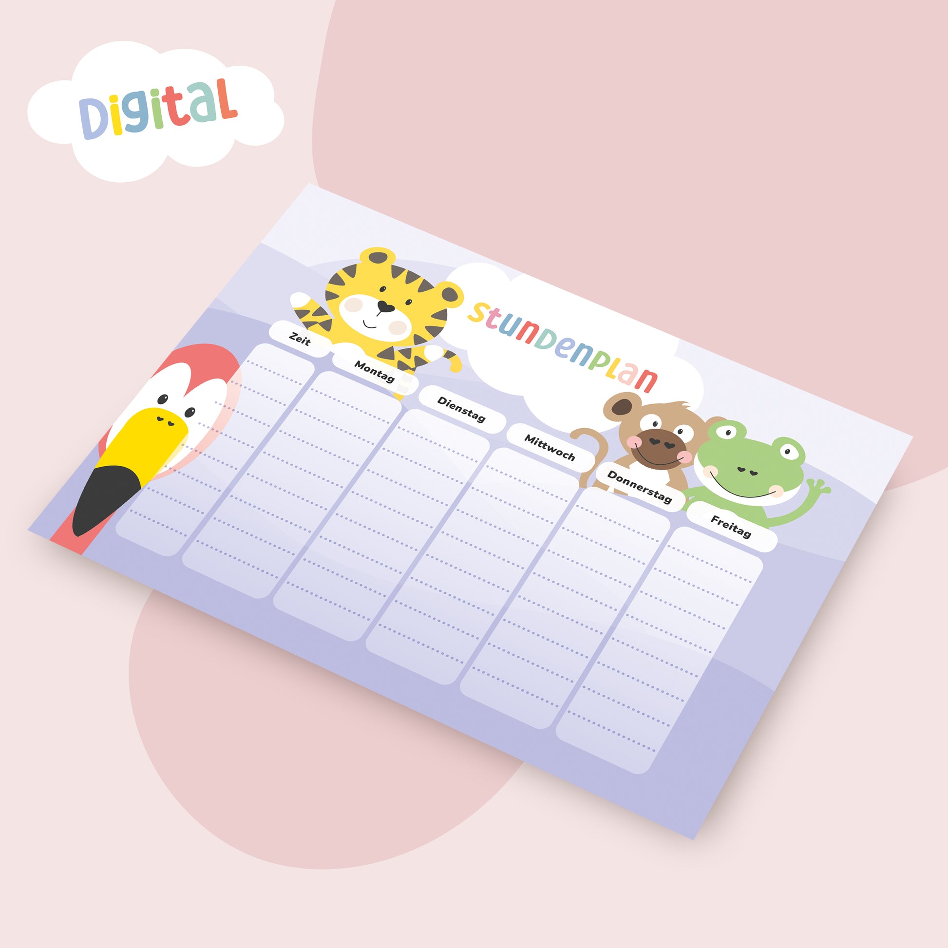 Bringe liebevolle Ordnung in den Alltag deines Kindes. Dieser fröhlich gestaltete Stundenplan im DIN A4-Format hilft deinem Kind dabei, die Woche übersichtlich zu planen – mit niedlichen Tiermotiven, die zum Entdecken und Mitmachen einladen. Ideal fürs Kinderzimmer, die Hausaufgabenecke oder auch für den Platz an der Familienpinnwand.